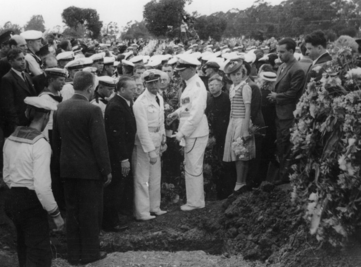 El capitán Langsdorff del AGS durante el entierro en el Cementerio del Norte.