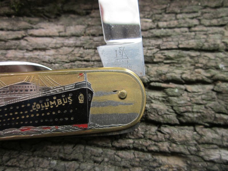 Navaja de dos hojas con cachas metàlicas de acero bronceado de 70 mm, con la imagen del transatlántico alemán Columbus. Hoja principal de 50 mm de largo en acero al carbono de alto pulido, en el recazo lleva el cuño del fabricante SMF Solingen, con la imagen de un rey sentado blandiendo una espada y en el anverso “Solinger Metallwaren Fabrik”. Hoja secundaria tipo “pen” de 35 mm de largo, también en acero al carbono. Muelle de acero al carbono, pasadores o pines en bronce. La ejecución es impecable, como era tradicional en esta firma alemana y su estado es como si recién hubiese salido de la fabrica, a pesar de que debe tener alrededor de los 90 años.