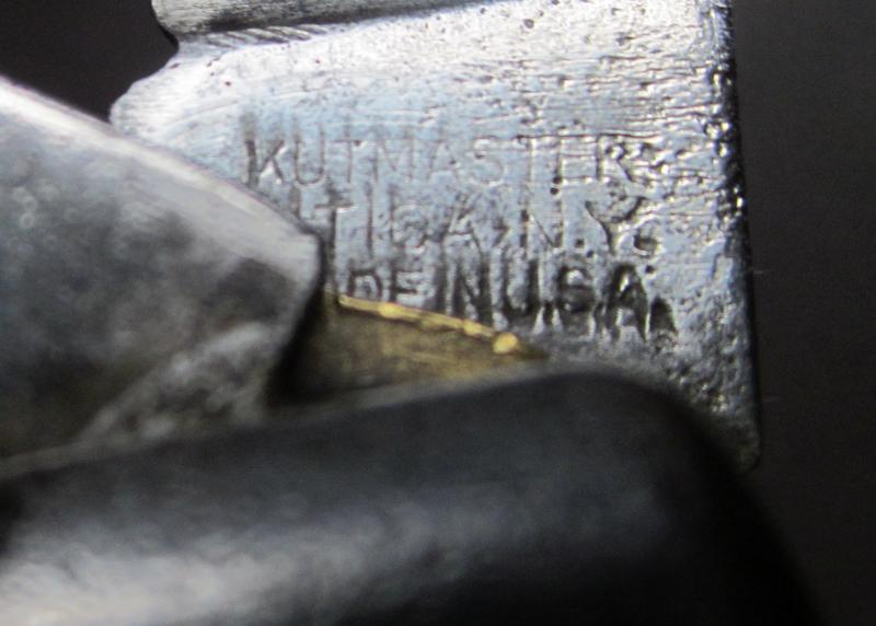 Lleva el cuño de Kutmaster - Utica N.Y. Made in USA, pero fué realizada por infinidad de fabricantes - entre ellos Camillus, Pal, Ka-bar, Remington, Schrade, Robeson, Union cutco. Generalmente llevaba marcada la inscripción TL-29 estampada en la madera, pero también la llevaba pintada - como en este caso, en que se ha borrado con los años y el uso.