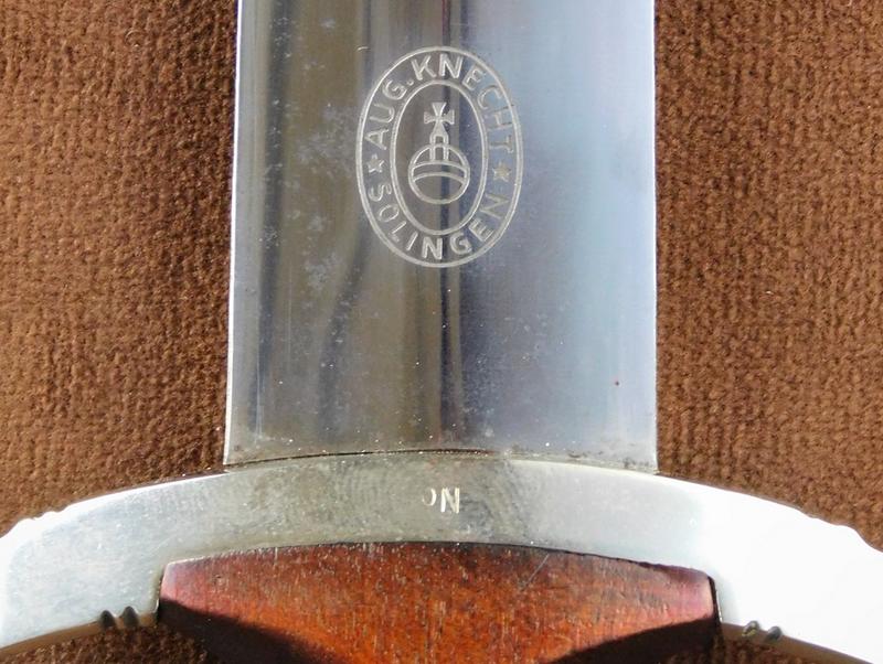 Antes de continuar un poco de información sobre la firma fabricante de la navaja, que es relativamente poco conocida: La vieja firma de August Knecht Stahlwarenfabrik fue fundada en 1825 y registrada en la Corte del Districto de Solingen el 21 de junio de 1869 – a pesar de que en los anuncios publicitarios publicados en la revista Messer und Schere de los años 30 declaraban que sus orígenes estaban en 1684. Sus marcas registradas fueron “Il Mondo” en 1912 y “Knecht” en 1898, el cuño utilizado era una orbe con una cruz imperial encima. En 1914 sus propietarios eran August Knecht y Carl Knecht, fabricando cuchillos, navajas, tijeras, navajas de afeitar etc. Durante los años 30 fabricaron dagas y cuchillos para las SA y NSKK, para ese entonces el propietario de la firma era Hugo Knecht, siendo su denominación “Aug. Knecht Stahl & Metallwarenfabrik. La firma continuó funcionando hasta poco después de 1945. Existió también otra firma llamada Aug. Knecht Jr (der Jüngere - el joven) fundada posteriormente en 1848, posiblemente familiar del anterior y que continuó hasta los años 90 aparentemente, pues no hay casi info al respecto. Daga de los años 30 Ahora veamos la navaja en sí: Se trata de una pieza de una sola hoja de acero al carbono con ranura corta/pelacables, cuerpo de 110 mm cerrada con cachas de madera veteada y bolsters de acero al carbono, liners, muelle y pines también de acero al carbono - en resumidas cuentas una sencilla herramienta de trabajo. Estimo que debe ser de los años 30 a mediados de los 40, por haber desaparecido la firma poco tiempo después del fin de la guerra. A pesar de sus años se ha mantenido en bastante buen estado, con un cierre bien sonoro y centrado de la hoja. Esta tipología fué fabricada por muchas firmas alemanas en aquellos años y continuó siéndolo desde los años 50 hasta hoy en día. Van las fotos Espero que les haya gustado, Un saludo |