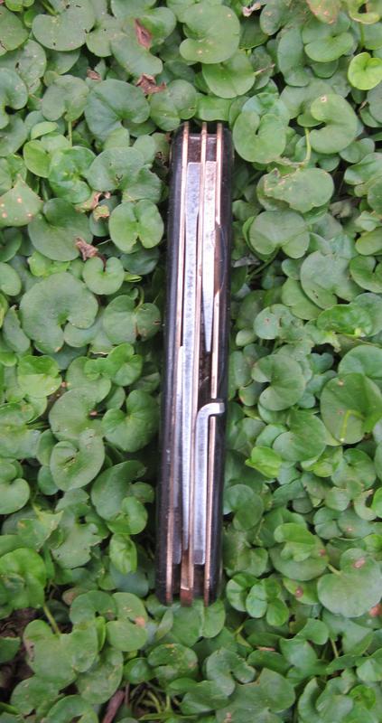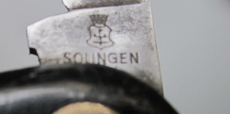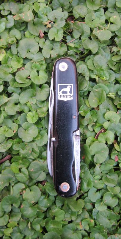 Se trata de una navaja multiusos de 6 útiles, a saber: hoja principal , hoja secundaria, punzón, abrelatas, corta/pelacables con destornillador plano y tirabuzón, distribuídos en 2 capas. Cachas de sintético negro o ballonita de 100 mm de largo, todos los útiles en acero al carbono inclusive los muelles, separadores de latón, pernos de acero con ojos de perdiz en latón. La navaja estaba bastante usada y descuidada cuando la encontré, pero la calidad de la fabricación es sobresaliente y pude dejarla rápidamente en condiciones. Estimo que la navaja podría ser de 1930/34 antes de que Büssing absorbiera a la firma NAG (Neue Automobil Gesellschaft) y el logo pasó entonces a ser Büssing-Nag, aunque podría ser de después de la guerra en 1950/60 cuando la firma volvió a ser Büssing , pero el hecho de que los materiales sean solamente acero al carbono y latón me hacen inclinar más por los inicios de los años 30.