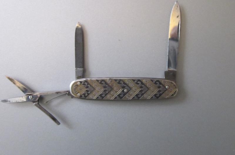 Se trata de una pieza fabricada por la vieja y conocida firma de Solingen J. A. Henckels Zwillingswerk con cachas metálicas de 72 mm con un hermoso trabajo grabado y esmaltado a dos colores, azul metálico y dorado. Cuenta con 3 elementos a saber: hoja principal - originalmente con un pulido de altísimo nivel y que ha sufrido algunas manchas de óxido debido al descuido pero que ha sobrellevado con mucha dignidad, tijeras y lima para las uñas, todo en acero al carbono. Se me hace difícil precisar el año de fabricación, así que debo estimar un período entre mediados de 1930 hasta mediados de los años 60, según materiales y estilo. Seguramente algún compañero del foro me va a poder ayudar en la datación - ya que hay varios fanáticos de la marca - que es una de las mas viejas de Solingen y con un alto nivel de calidad de la firma de los mellizos o muñecos.