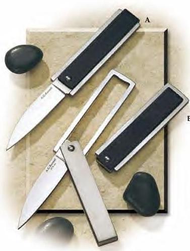 Es de gran sencillez constructiva, estando constituída por una chapa plegada de acero inoxidable que oficia de mango donde se esconde la hoja que va montada dentro de otra chapa plegada que pivotea en un extremo y al girar expone la hoja. A pesar de la sencillez – que la presta mucho para ser utilizada como navaja de propaganda o publicitarias – hay fabricantes que la realizan de una forma mucho mas sofisticada con una placa mecanizada, como luego veremos y que alcanzan precios elevados.