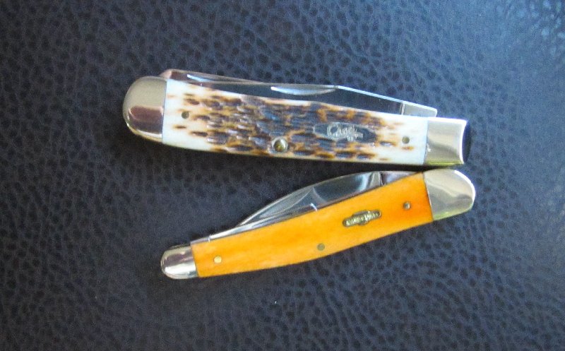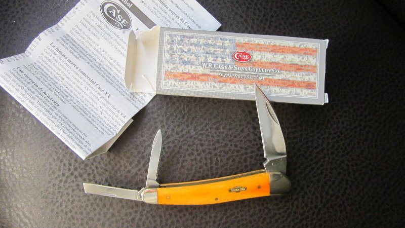 Navaja de tres hojas, con cachas de hueso pulido teñido – en este caso de color anaranjado – de 101mm (4 pulgadas) de largo cerrada, con el inserto del escudo de Case. Hoja principal muy contundente en estilo Wharncliffe de 55 mm de largo por 4 mm de espesor de acero inoxidable quirurgico (Case Tru-Sharp), las hojas secundarias también en acero inoxidable, una del tipo “pen” y la otra “coping”, los liners o separadores y pines en latón, muelles de acero inoxidable y virolas/bolsters en alpaca.