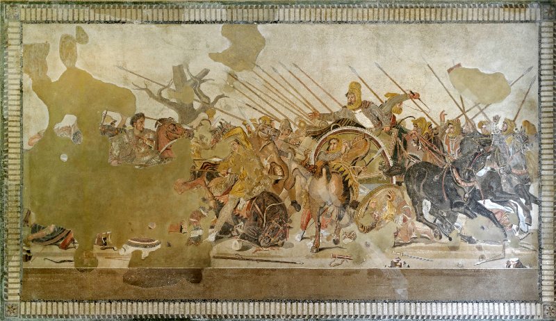 PD: Como sé que te va a gustar, adjunto la imagen del mosaico que representa la batalla de Issos, entre los griegos de Alejandro Magno y los persas de Darío,. Según parece este mosaico es una copia romana - hallada en Pompeya - de la pintura original atribuída a Apeles.