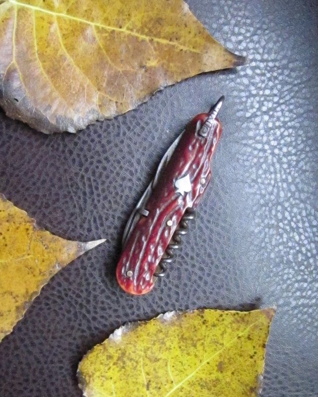 Navaja multiusos al estilo de las Boker 182, cachas de “Jigged Bone”, o hueso teñido y tallado (le tuve que hacer la prueba de la aguja al rojo para confirmar, porque parecía algún tipo de material sintético), de 92 mm de largo cerrada, con 6 útiles, todos en acero al carbono, hoja principal y secundaria, abrelatas, destapador corona con destornillador plano, punzón rascador y tirabuzón, muelles de acero al carbono, separadores y pines de latón, lleva una anilla de acero con tallados y que aparenta haber tenido un recubrimiento color laton.