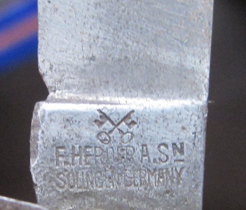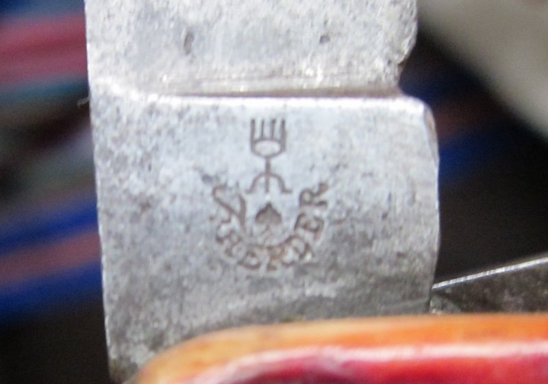 Lleva el cuño de Friedrich Herder Abr. Sohn, un viejo fabricante alemán de Solingen y tiene la particularidad que presenta los cuños más importantes del fabricante: el de las 2 llaves cruzadas en el recazo de la hoja principal , encima del nombre del fabricante, y en el lado opuesto los otros dos cuños, el candelabro y el as de picas, encima del nombre F. Herder. Hace más de dos años mostré otra vieja navaja de Herder en el post "La Kriegsmarine intenta rescatar...una herradura!!" AQUI