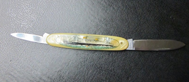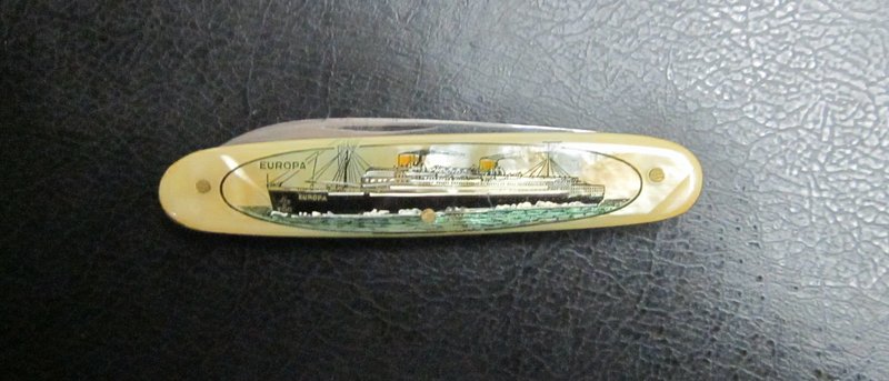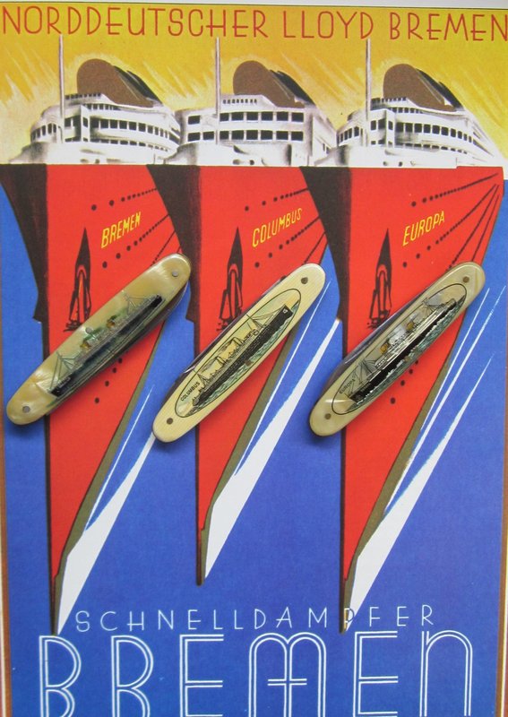 No sé si los compañeros recordarán unos posteos que realicé hace tiempo sobre las navajas de souvenir de los más grandes transatlánticos alemanes del período entreguerras: el Bremen +Aqui y el Columbus + Aqui . En esa oportunidad les comentaba que estaba a la caza de la navaja del tercer transatlántico que formaba la trilogía de la compañía naviera NDL - Norddeutsche Lloyd Bremen.- Finalmente la espera dió sus frutos, pues apareció la pieza que faltaba y ya les detallo: