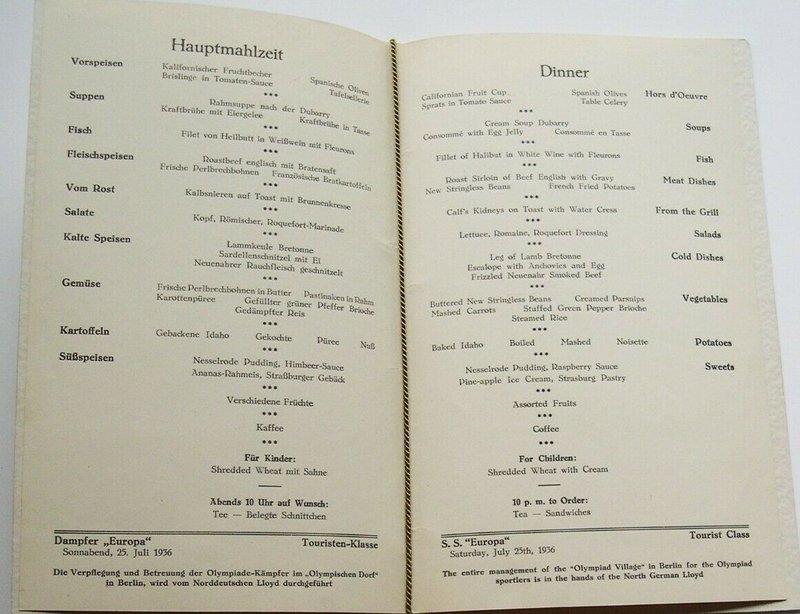 Un detalle al pié de página del menú da cuenta de que el manejo de la Villa Olímpica de Berlin (Olimpiadas 1936) está a cargo de la NDL
