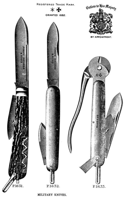 Cuchillo cortador de alambre John Watts,con "JOHN WATTS SHEFFIELD ENGLAND" estampado en el tang de la hoja de corte y la PATENTE DE WATT estampada en el brazo del cortador de alambre. La longitud cerrada es de 4,5 pulgadas. Es difícil datar este cuchillo, pero tengan en cuenta que el abrelatas es el mismo que se utilizaba en común en la Primera Guerra Mundial y la mayoría de los componentes (excepto la hoja de corte) están niquelados, lo que sugiere que se hizo más probable entre la introducción del electrolito comercial niquelado en 1916 y finales de la década de 1920, y por lo tanto tal vez también debería ser visto en el contexto del original Joseph Rodgers "Military Knife P.1633."