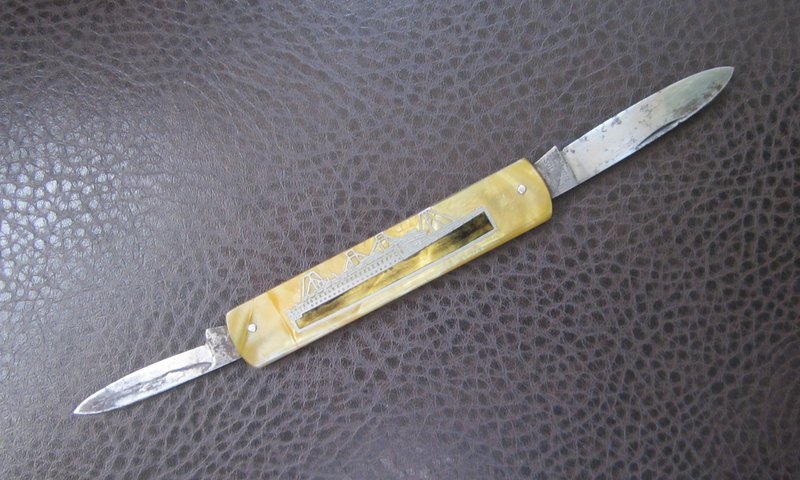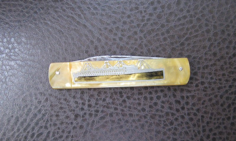 Efectivamente, en esta oportunidad trataremos una navaja de souvenir del transatlántico británico SS Laurentic botado en 1927 para el servicio entre Inglaterra, Canadá y el Mediterráneo, que en 1940 – convertido en crucero auxiliar británico – tuvo la desventura de cruzarse en el camino del submarino U-99, al mando de la “herradura dorada” capitán Otto Kretschmer, el más exitoso de los submarinistas alemanes en la 2 GM. Estas navajas promocionales o de souvenir se podían adquirir en la tienda del propio transatlántico o eran obsequiadas por los oficiales del buque a pasajeros destacados.