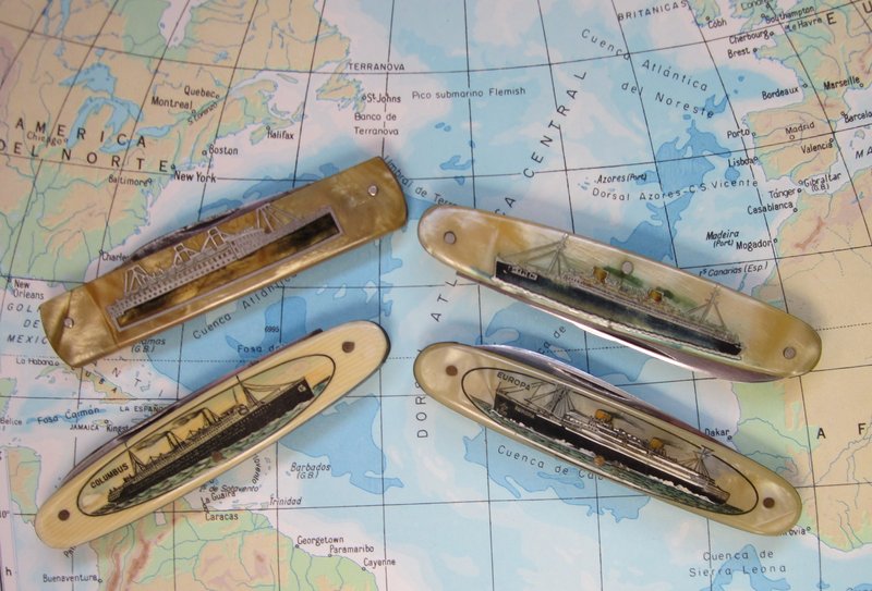 Querido amigo Juan: Me encanta leer tus historias, más aún, si cabe, cuando se trata un tema como el de los comandantes de submarino alemanes a los que siempre he admirado y que tú relatas con tanta fuerza, pasión y destreza. La navaja, una pequeña joya alemana de recuerdo de un barco inglés, digna de estar en tus manos y de ser conocida, gracias a ti, por todos. Un fuerte abrazo. Félix Amigazo Félix, que gusto recibir tu visita y estimulantes comentarios, justamente aquí en medio del Atlántico Norte!!! Celebro que te haya gustado el post, con navaja e historia que se entremezclan en las nubes misteriosas del pasado. Compartimos la admiración por esos comandantes que hicieron historia y agradezco muy especialmente tus palabras. Un gran abrazo!! Un encuentro en medio del Atlántico de cuatro navajas alemanas - tres transatlánticos alemanes y uno inglés - todos ellos escribieron sus páginas en los albores de la IIGM, corriendo con distinta suerte: El Bremen, el Columbus, el Europa y el Laurentic. Un saludo para el amigo Félix, de parte del Kapitän Günther Prien - otro comandante alemán que tuvo la guapeza de meterse en Scapa Flow, a bordo del U-47. |