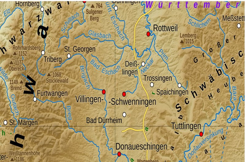 Ubicación de Tuttlingen a orillas del Danubio y la cercana ciudad de Rottweil en la zona de la Selva Negra.
