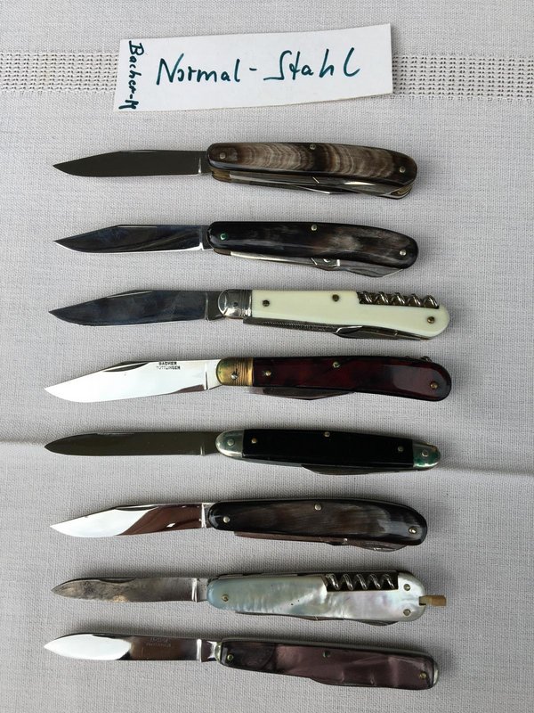 A continuación, me gustaría darles una idea de los cuchillos "Messer-Bacher" restantes. Los cuchillos marcados como acero inoxidable provienen de mi abuelo, Bruno. Los cuchillos que aún no son inoxidables son ejemplos más antiguos que podrían haber sido fabricados tanto por Ernst como por Bruno Bacher."