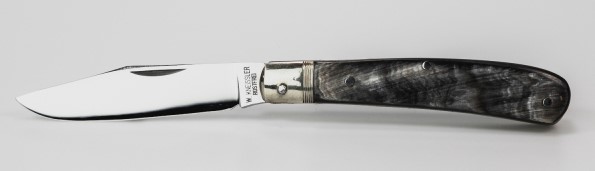 Navaja de dos elementos útiles, cuerpo de 100 mm de largo cerrada, con cachas de cuerno rubio. Hoja principal del tipo “clip” de 75 mm de largo en acero al carbono, con el cuño de Gustav Branner en el recazo – representado por una cara tipo “emoji” con un cuchillo en la boca y las orejas representadas por las letras GB. El segundo elemento es el rascador “holzreisser” también en acero al carbono, de 50 mm de largo. Liners, muelle, pines y pasadores también en acero al carbono. Bolsters en latón.