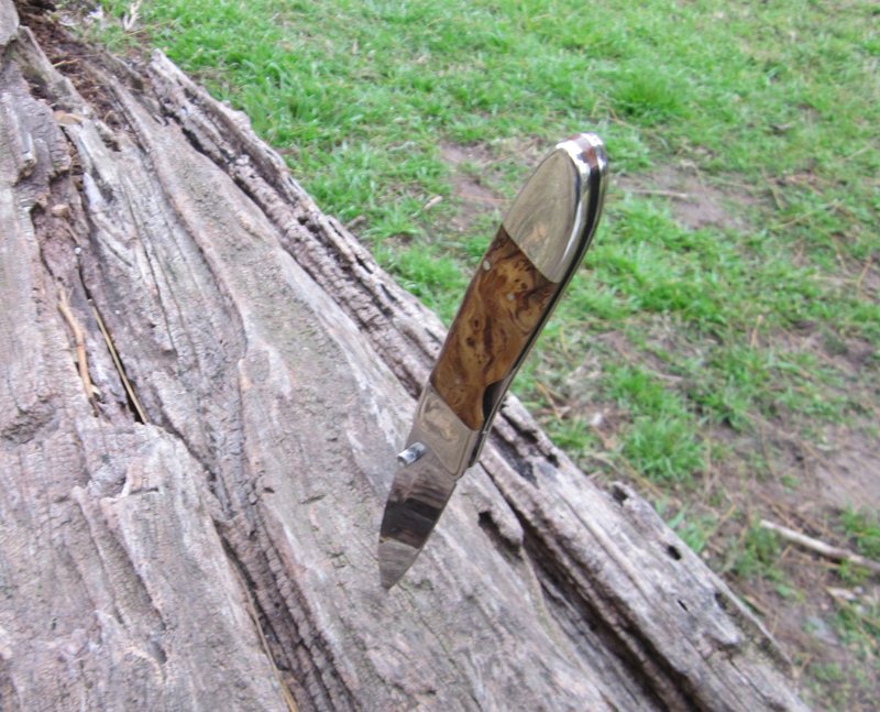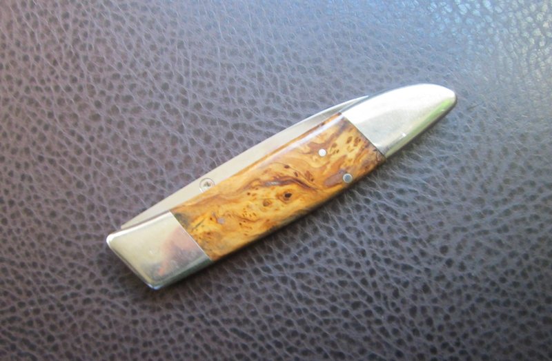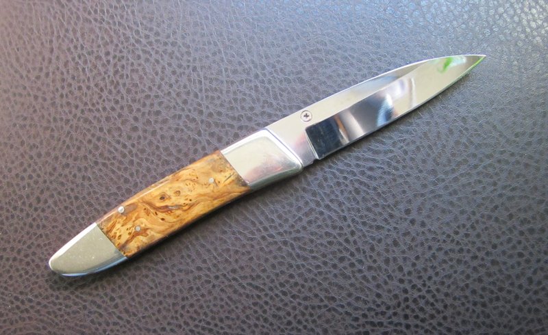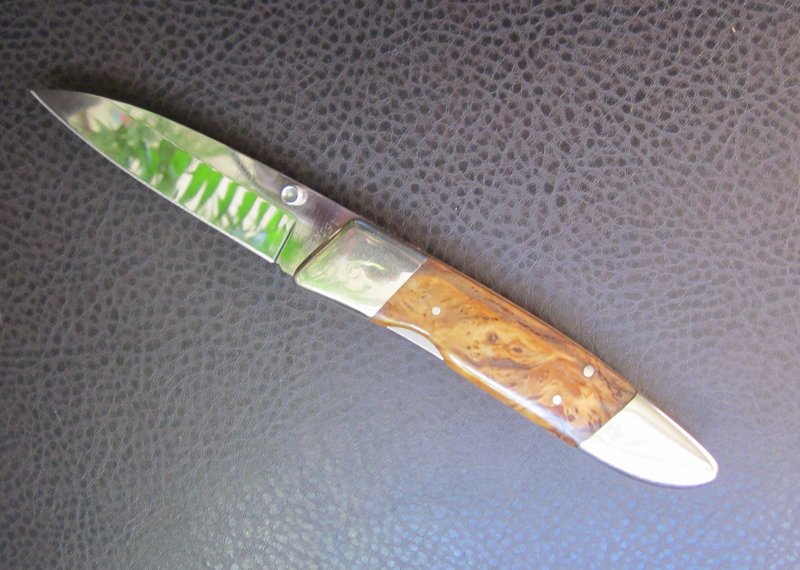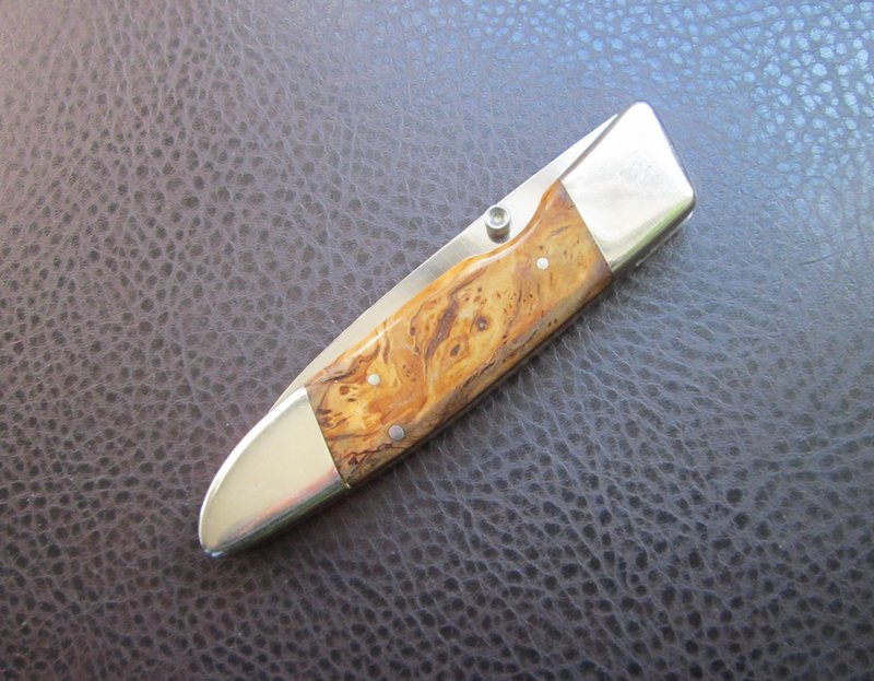 Navaja linerlock de una hoja, con cachas de raíz de olivo de 118 mm de largo cerrada. Bolsters y pines de alpaca. La hoja – estilo drop point – mide 80 mm de largo y está realizada en acero inox.440, lleva en el recazo el marcaje AESH 2006 (iniciales del Maestro artesano y año de fabricación). Lleva también un tetón diestro de apertura y presenta vaciado cóncavo.