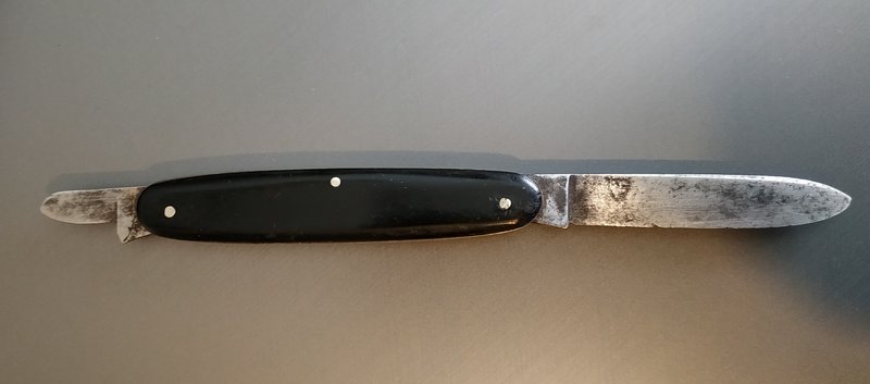 Navaja de dos hojas con cachas sintéticas negras de 85 mm de largo con unos preciosos insertos de alpaca. Hoja principal de acero al carbono de 60 mm de largo con signos de haber sufrido fuerte oxidación, con el recazo marcado Made in Germany – sin presentar cuño del fabricante lamentablemente. La hoja menor también en acero al carbono que presenta la mutilación de la mitad de su longitud. Liners de latón, pines y pasadores de alpaca y muelle de acero carbono. Muy bien construída a pesar de que no lleva el marcaje del fabricante y que está funcional a pesar de sus años que deben ser más de 80, según veremos luego por la variación del símbolo de Continental inserto en las cachas.