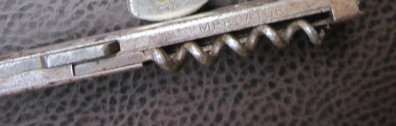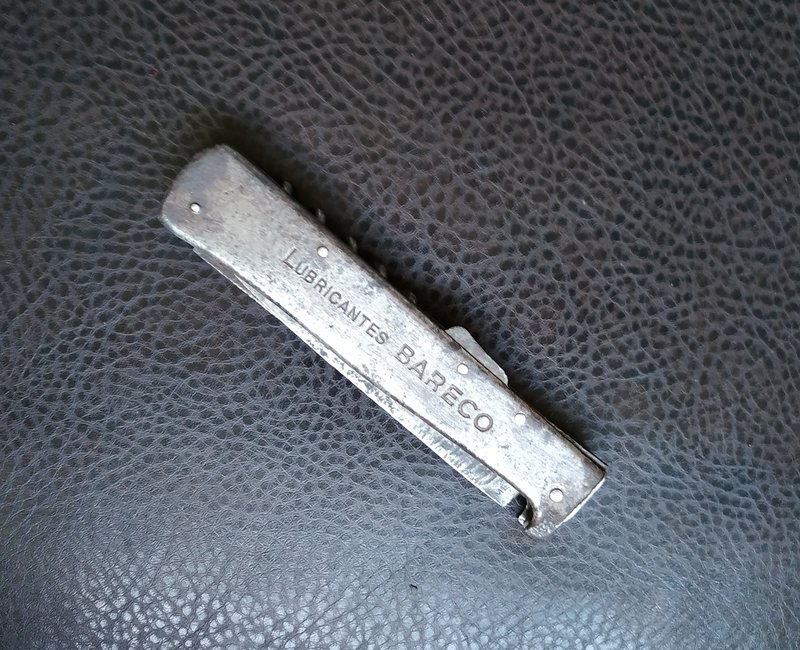 - Destapador de tapas corona de 45 mm de largo, también en acero al carbono y que cuenta también con la función destornillador plano y borde cortador/rascador afilado, además de ranura de uña, llevaba un tetón de apertura que se perdió.