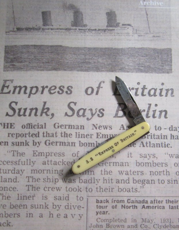 Como en el tradicional juego de la “batalla naval” estas palabras identifican la suerte corrida por el “Empress of Britain” – el mayor y más lujoso de los transatlánticos ingleses botado en 1931, y que viene a cuento por el hecho de haberme encontrado una navajilla de souvenir de este buque, tocado por dos bombas de un bombardero alemán a 70 millas al noroeste de la costa de Irlanda y hundido por el submarino U-32 en 1940, veámosla: