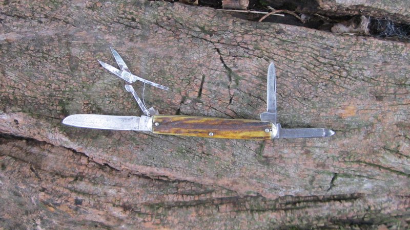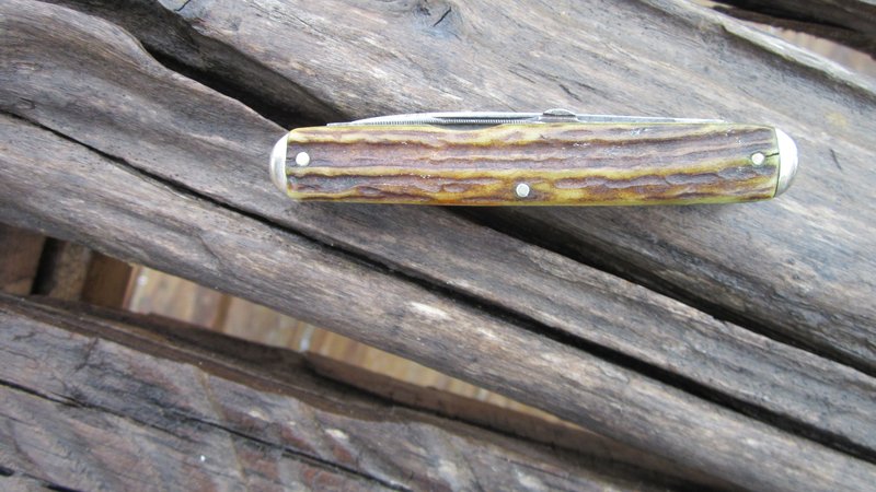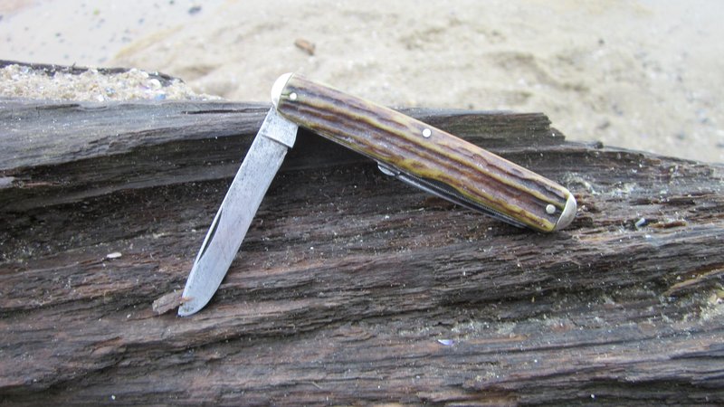 Navaja de cuatro elementos en dos capas, de 86 mm de largo cerrada con cachas de un viejo ciervo muy vistoso, construìda en la tipologìa que los yankees llaman "Equal end Whittler", los bolsters son de alpaca, del tipo pequeño - o "Tip".
