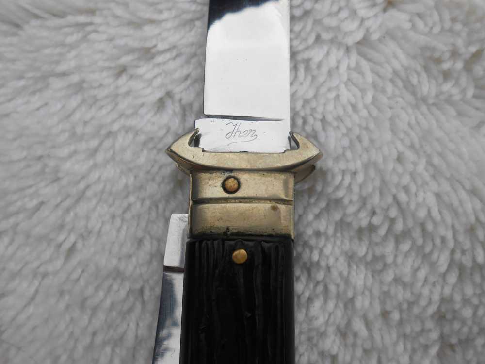 Material de las cachas: Latón en forros y separador y micarta negra “pata negra” de Aitor, fijada con tres pasadores de latón, más el que sirve de eje, virola plateada con “uñas” para la extracción de cartuchos (los antiguos cartuchos se fabricaban en cartón y siendo las escopetas habituales las de dos cañones estos extractores en las navajas eran comunes para poder ayudar a extraer los cartuchos que se empeñaban en quedarse pegados en las recámaras), y una amplia anilla para poderla “asegurar” y evitar su pérdida.