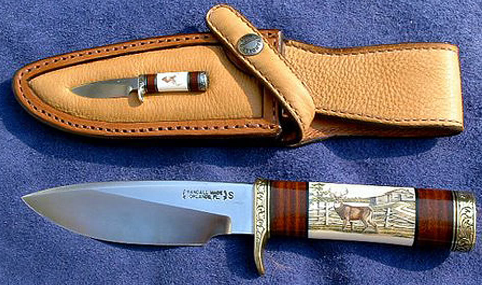 No tan sólo está grabado en pomo y guarda,scrimshaw en el marfil del mango sinó que lleva incrustado uno en miniatura en su funda...