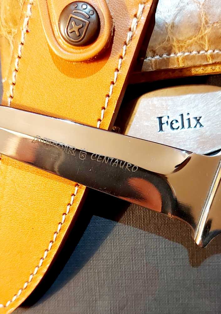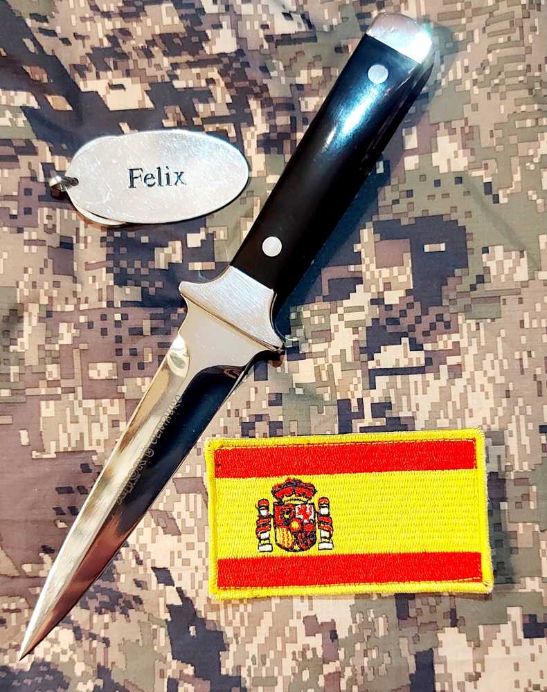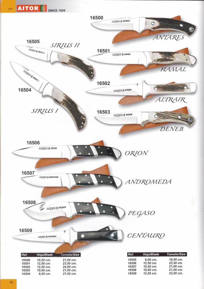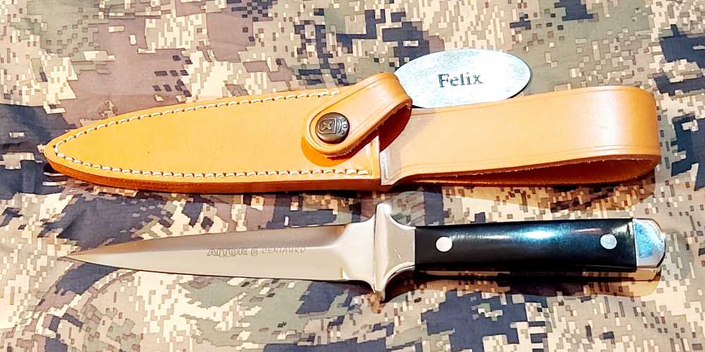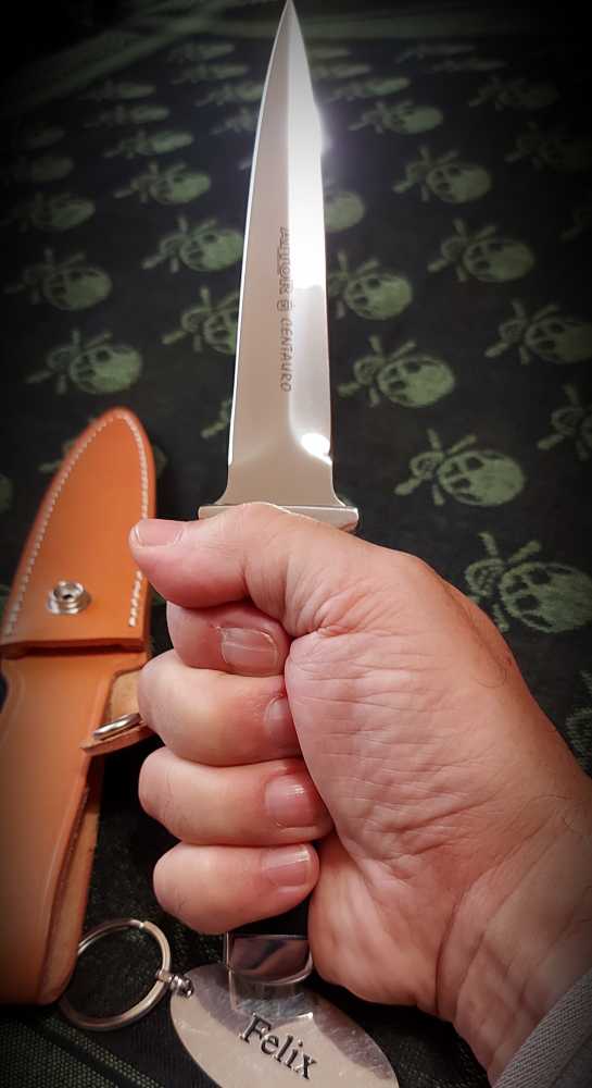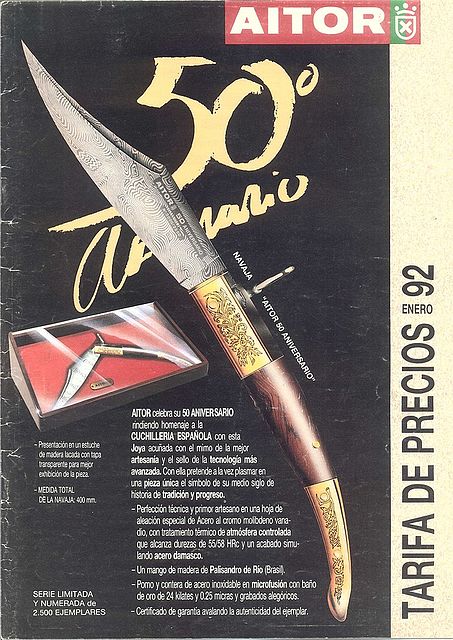 Es un cuchillo de Aitor, del que desconozco la época, aunque por no haberle visto nunca en ninguno de sus catálogos de su “época dorada”, deduzco que pudiera ser un cuchillo, o hablando con mayor propiedad una daga, diseño de la última época de Aitor (Ermua) lo que considero muy muy poco probable, por no decir que imposible, pues no aparece en ninguno de sus catálogos que conozco o, seguramente, de la primera época de Aitor-Pielcu, y/o bien, un diseño del que se hizo una edición o tirada muy limitada.