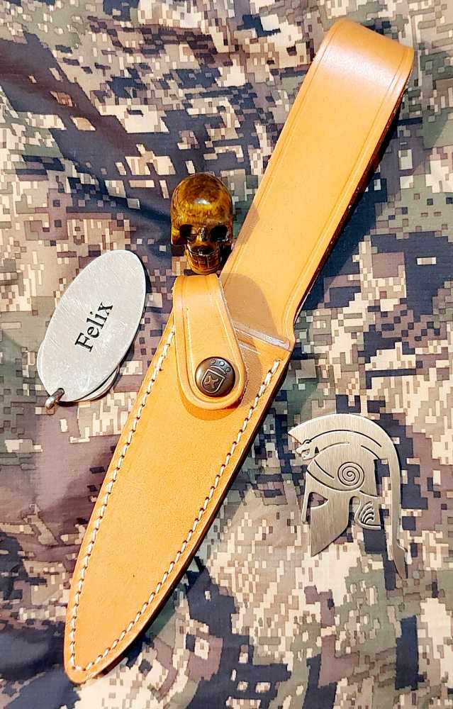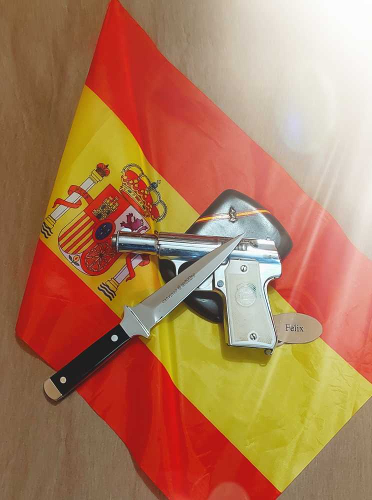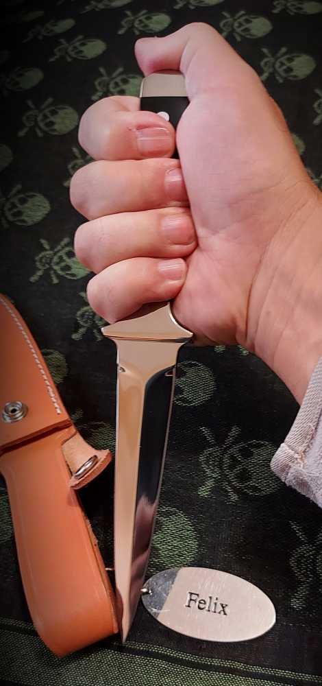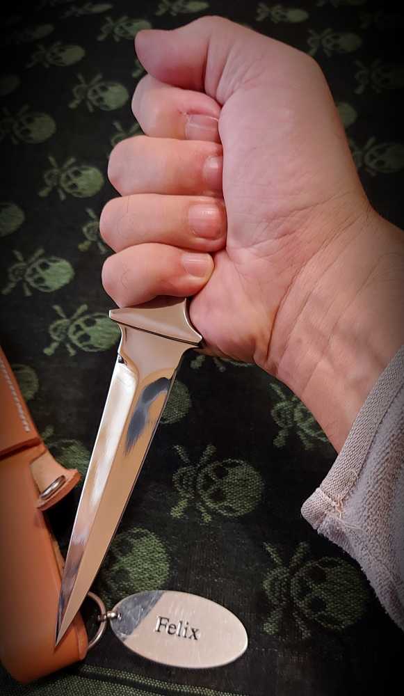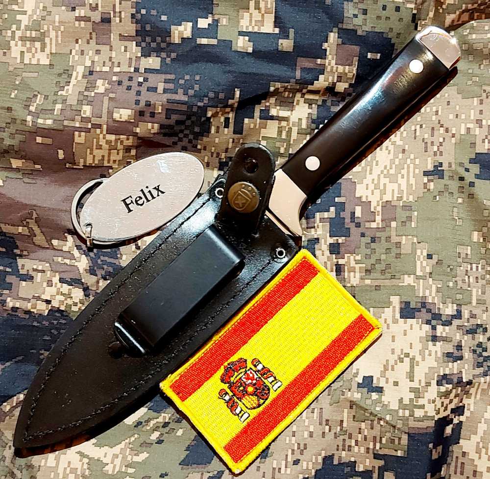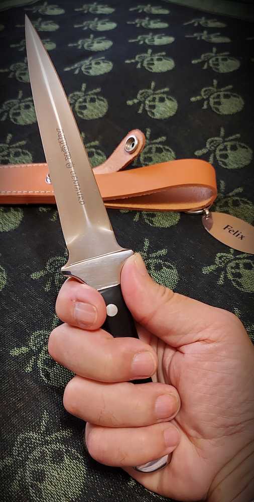 Es un cuchillo de Aitor, del que desconozco la época, aunque por no haberle visto nunca en ninguno de sus catálogos de su “época dorada”, deduzco que pudiera ser un cuchillo, o hablando con mayor propiedad una daga, diseño de la última época de Aitor (Ermua) lo que considero muy muy poco probable, por no decir que imposible, pues no aparece en ninguno de sus catálogos que conozco o, seguramente, de la primera época de Aitor-Pielcu, y/o bien, un diseño del que se hizo una edición o tirada muy limitada.