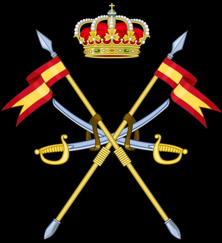 Pasantes en aspas, dos lanzas, la que está en barra sobre la otra, con punta de doble corte y regatón, con banderolas flameantes en las que se señalan los espacios de los colores de la Bandera Nacional, resaltado de dos sables en igual posición, empuñaduras en lo bajo, con las cazoletas hacia abajo y las hojas pasando por los porta lanzas.