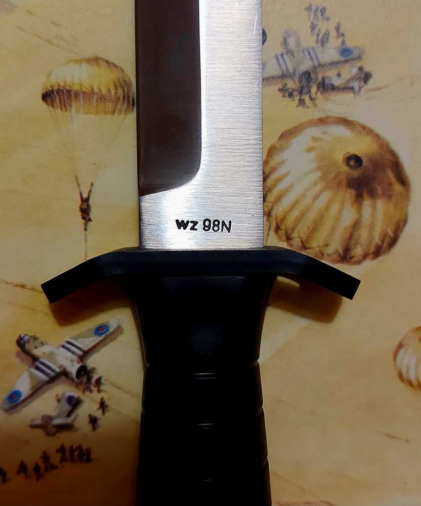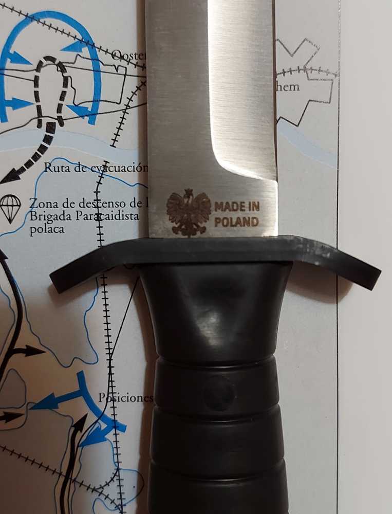 Como curiosidad, la guarda está "invertida" (a diferencia de la mayoría de las guardas en forma de S, se curva hacia el filo) porque los agarres estándar del ejército soviético requieren sostener el cuchillo con el borde hacia arriba, algo que, al parecer también se realizaba con el tanto japonés, dificultando de esta manera los intentos de parar el tanto que se enseñaban en diferentes artes marciales. También era la forma en que se empuñaban los “bowies”, en el lejano oeste, cuando se empleaban para el combate cuerpo a cuerpo. No sé si los polacos lo usaban igual, pero copiaron hasta la forma de la guarda.