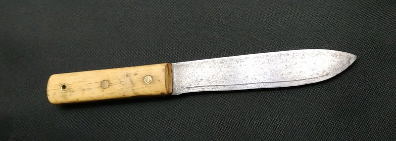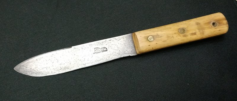 Cuchillo de espiga enteriza con hoja de acero al carbono de 130 mm con el cuño del león tumbado, de 25 mm de ancho, con un espesor de 2,7 mm, que presentaba fuerte oxidación. El largo total es de 237 mm. Mango de madera de color claro – que podría ser abedul – y que difiere de la madera utilizada normalmente de bubinga, posiblemente debido a circunstancias particulares del momento de producción, dado que el cuchillo es muy viejo, como veremos. Remaches de bronce/latòn, asi como también el buje del pasatiento.