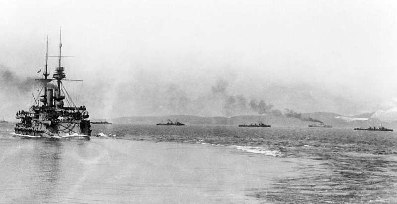 Nueva ojeada a través del lente, que nos revela la presencia de otro acorazado del tipo “Triumph”, alrededor del cual hay el acostumbrado movimiento de buques menores.