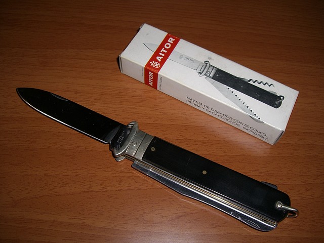 NAVAJA DE CAZADOR le viene “al pelo”, aunque hay muchas navajas con ese nombre, incluso alguna otra de AITOR, sus características, sus “usos”, tamaño y la adicción de la virola plateada con “uñas” para la extracción de cartuchos la hacen una segura acreedora de ese título,
