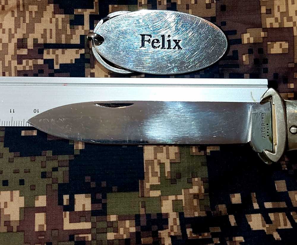 Longitud de la hoja: unos 105 milímetros de acero AITOR INOX SPAIN, semipulido, y digo unos 105 milímetros porque esa es su longitud oficial, aunque la mía, medida por mí, tenga solo 103 milímetros.
