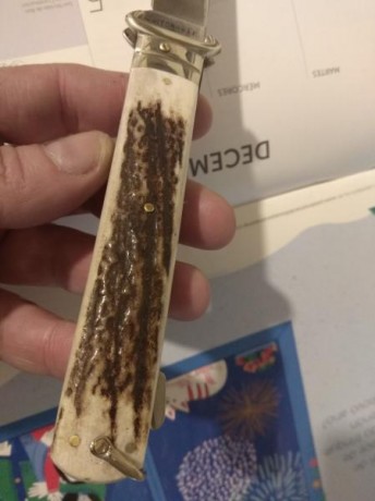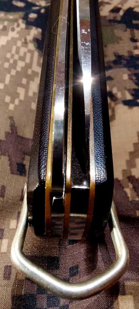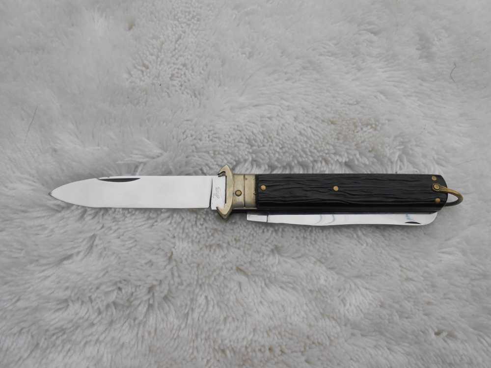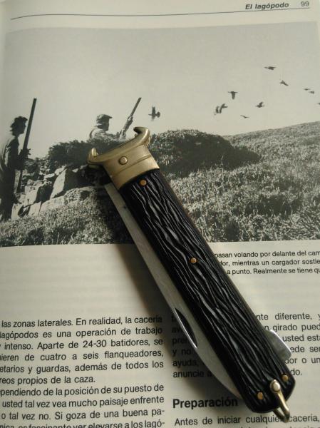 Material de las cachas: Latón en forros y separador y micarta negra “pata negra” de Aitor, fijada con tres pasadores de latón, más el que sirve de eje, virola plateada con “uñas” para la extracción de cartuchos (los antiguos cartuchos se fabricaban en cartón y siendo las escopetas habituales las de dos cañones estos extractores en las navajas eran comunes para poder ayudar a extraer los cartuchos que se empeñaban en quedarse pegados en las recámaras), y una amplia anilla para poderla “asegurar” y evitar su pérdida.